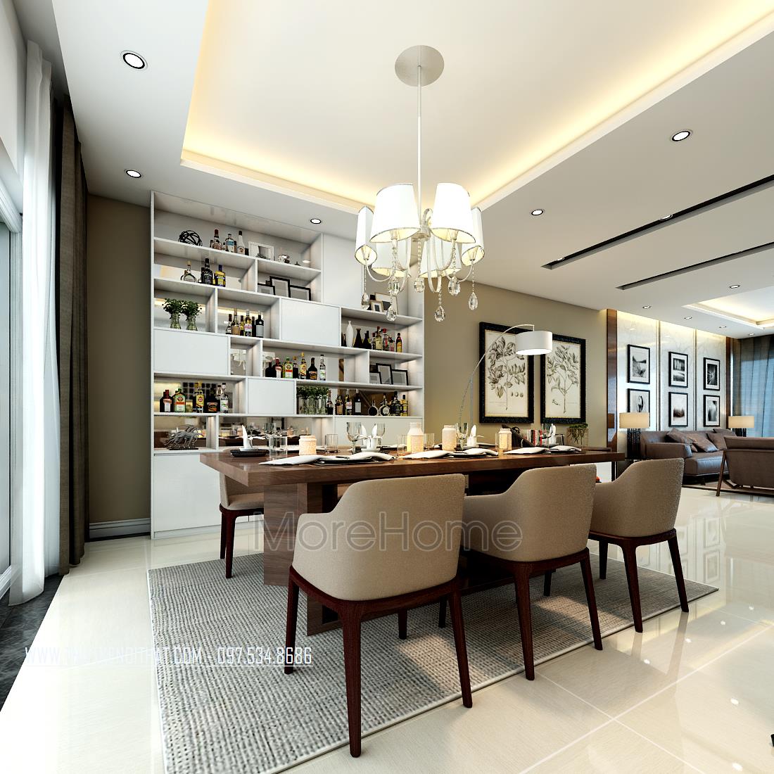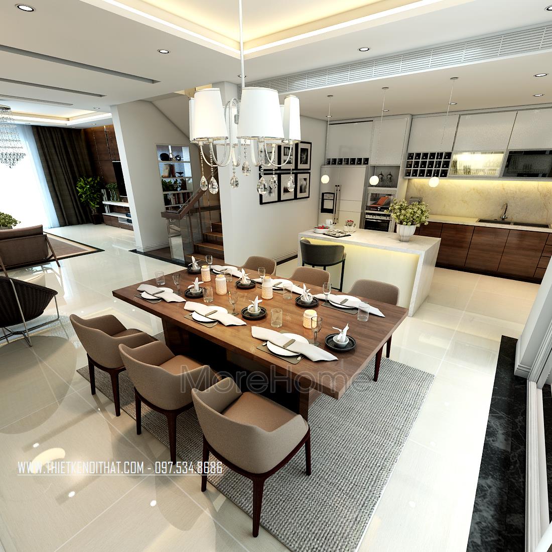Bộ bàn ăn được đặt liền kề với phòng khách và căn bếp giúp tạo sự liền mạch, tiện nghi cho sinh hoạt trong gia đình. Thiết kế bàn ăn dài, rộng phù hợp với không chỉ các bữa cơm thân mật của gia đình mà còn dành cho cả các buổi tiệc của gia đình với nhiều thành viên. Tone màu nâu trầm từ thiết kế bàn ăn giúp không gian trở nên vô cùng ấm áp và gần gũi.
