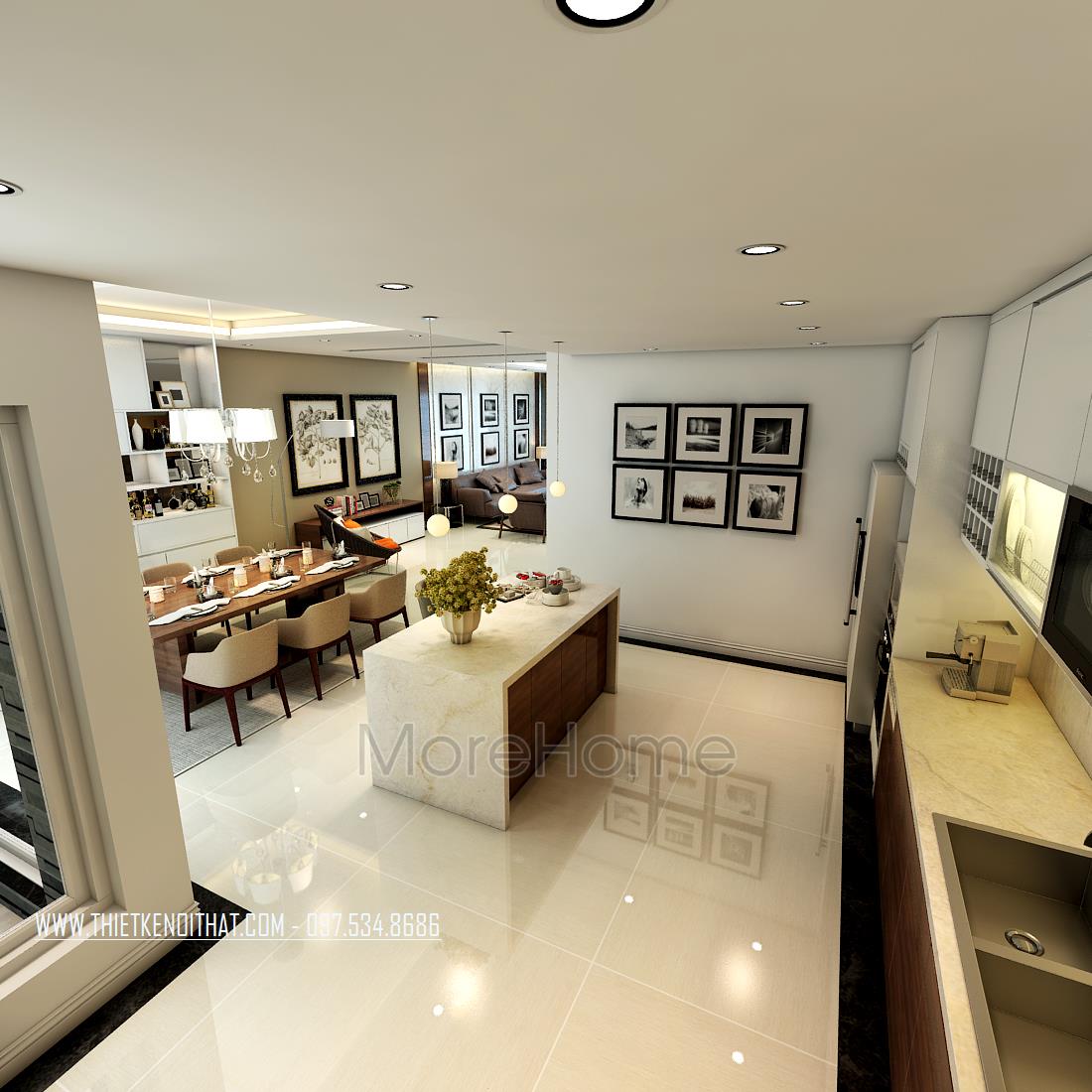 Tiếp theo là thiết kế nội thất căn bếp phong cách hiện đại sử dụng tone màu trắng làm nền chủ đạo. Thiết kế gọn gàng mà vẫn đảm bảo tính công năng. Không sử dụng nhiều chi tiết trạm khắc rối mắt và phức tạp, kiến trúc sư tập trung nhiều hơn vào các chi tiết nhỏ, đa năng hay đơn giản hơn chính là thiết kế linh hoạt, kết hợp giữa kệ tủ, đa ngăn, đa năng vừa đảm bảo tính công năng lại giúp tiết kiệm diện tích. Ánh sáng ở bếp cũng được kiến trúc sư đặc biệt chú trọng, thay vì các thiết kế bố trí một nguồn ánh sáng chính, kiến trúc sư đã khéo léo điều phối ánh sáng và phân chia thành các khu vực chiếu sáng khác nhau giúp không gian trở nên khác biệt, dịu nhẹ mà không hề làm ảnh hưởng đến tính thẩm mỹ.