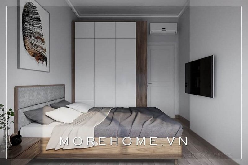 Ấn tượng với kệ tủ đồ gỗ kết hợp, thiết kế âm tường kịch sàn rất tiện lợi và phù hợp với không gian căn phòng ngủ chung cư, nhà phố.
