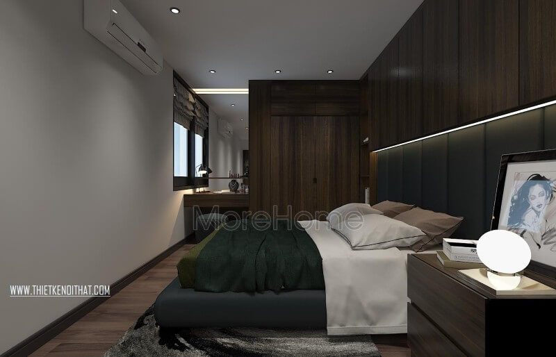 Nội thất phòng ngủ master tại căn hộ chung cư 2 phòng ngủ được thiết kế thi công theo phong cách hiện đại với tông màu trầm ấm áp