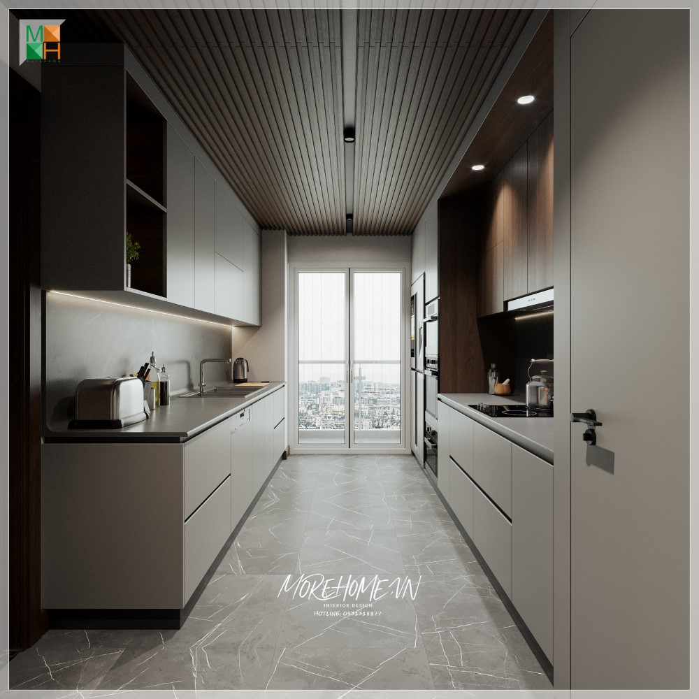 Phòng bếp căn hộ hỗ trợ tốt cho sử dụng nấu nướng hằng ngày tiện nghi thoải mái mang thẩm mỹ cao cho không gian.