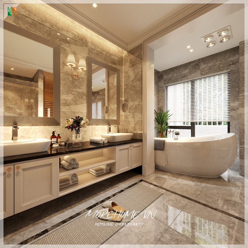 Phòng tắm chung cư được trang trí với các thiết bị vệ sinh hiện đại, bao gồm các gương trang trí, đá ốp tường và vách tắm kính.