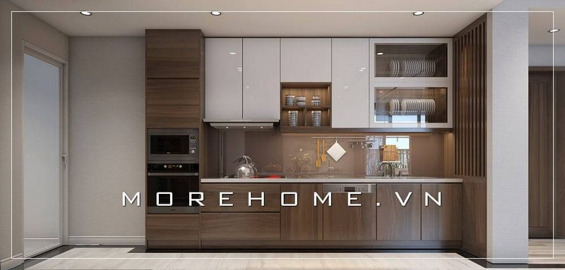 Mẫu tủ bếp gỗ công nghiệp màu nâu hiện đại, có thiết kế chữ I phù hợp với phòng bếp của các căn hộ nhỏ.